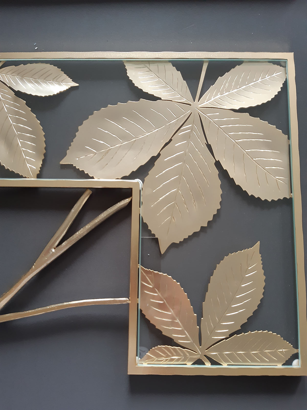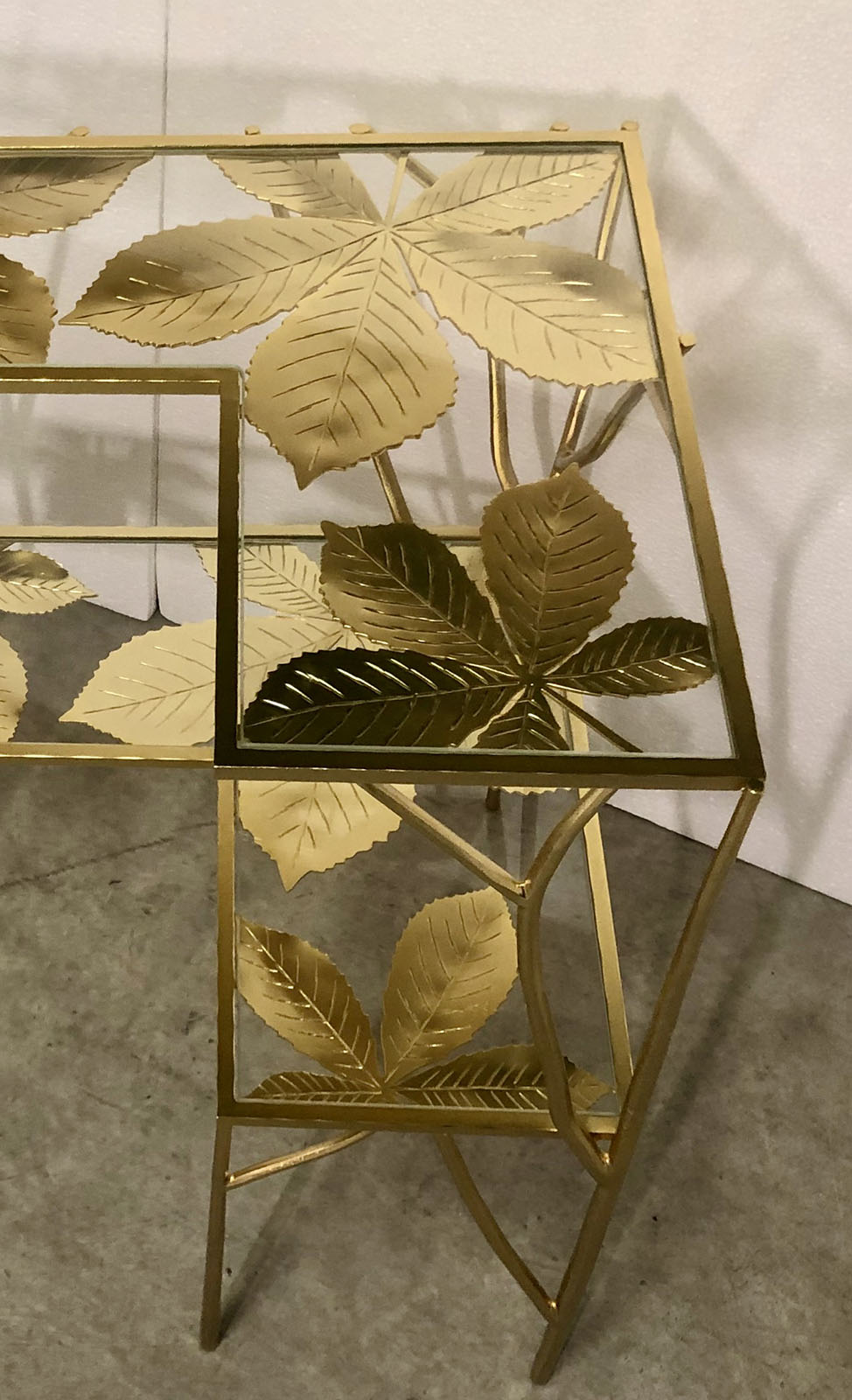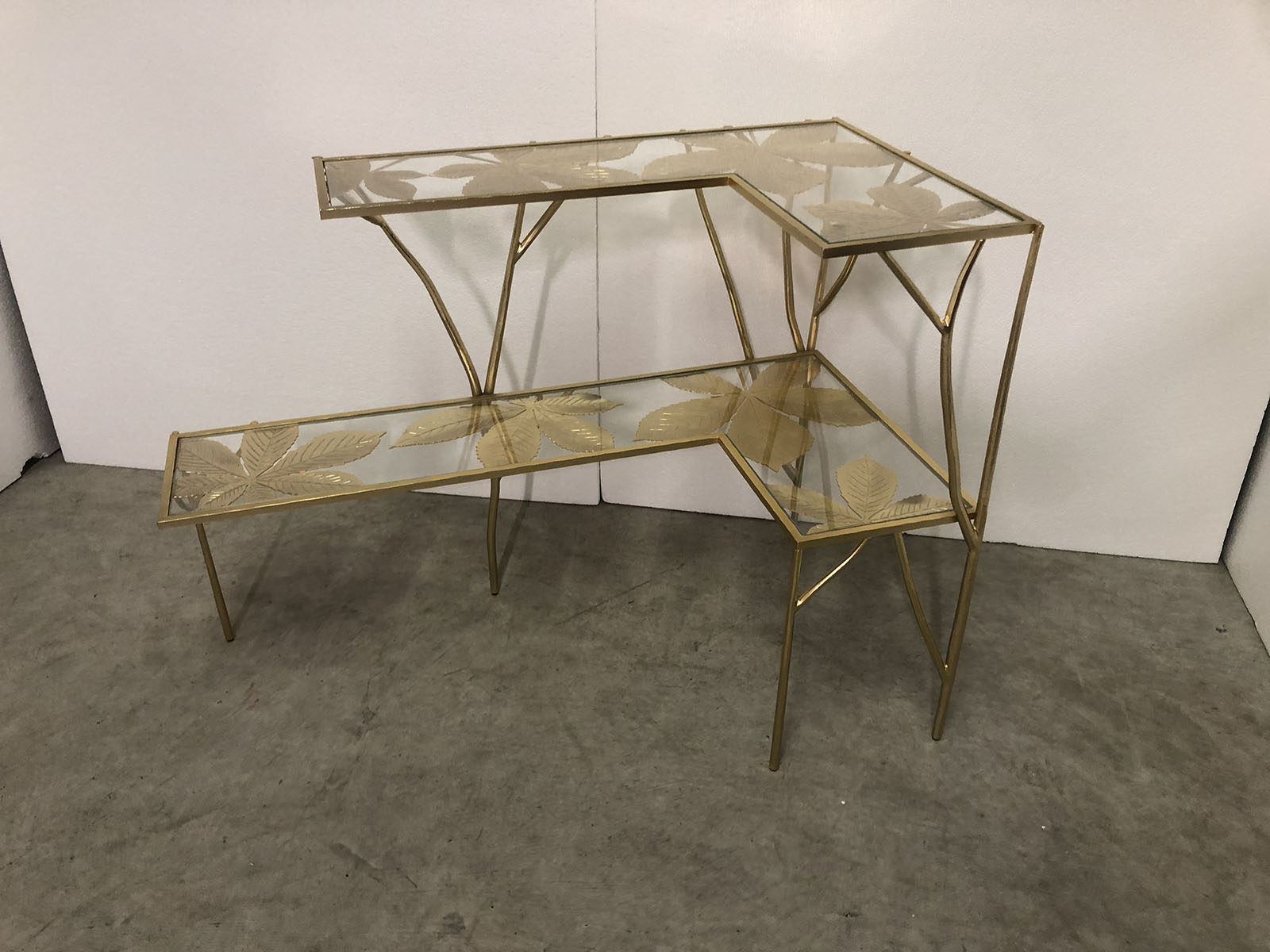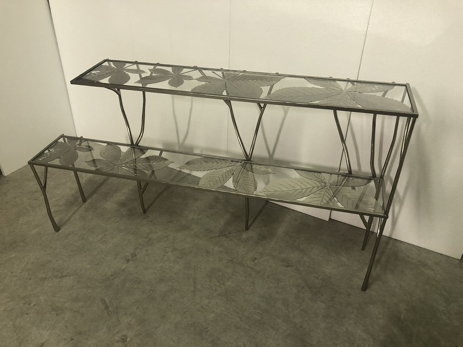 70 Etagere in diverse dimensioni per il minibar delle camere costituite da una struttura in metallo forgiato ispirate ai rami e alle foglie degli alberi, completate da ripiani in vetro sagomato.