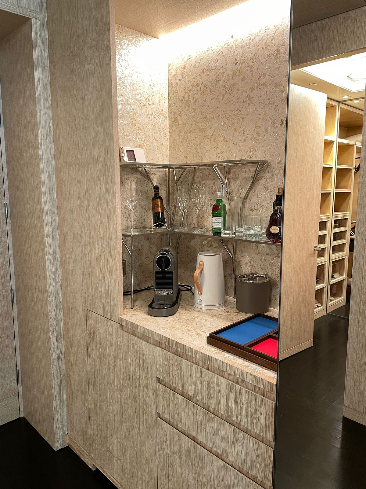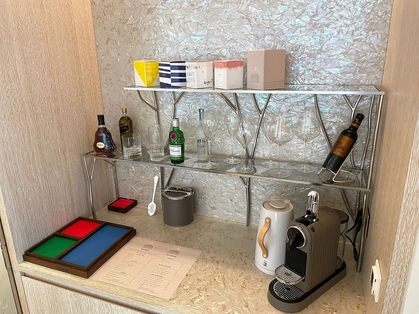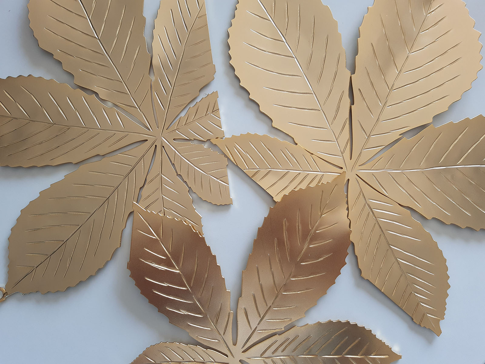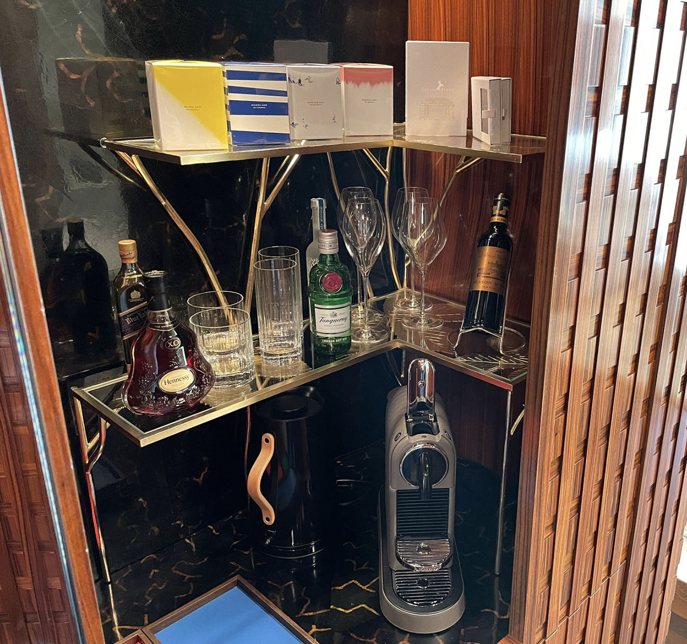 70 Etagere in diverse dimensioni per il minibar delle camere costituite da una struttura in metallo forgiato ispirate ai rami e alle foglie degli alberi, completate da ripiani in vetro sagomato.