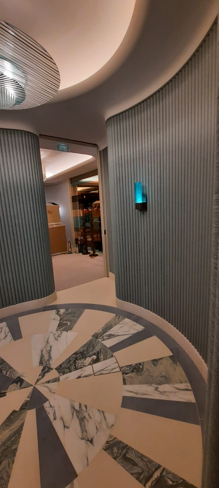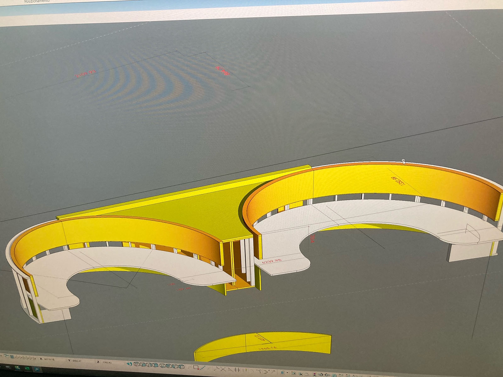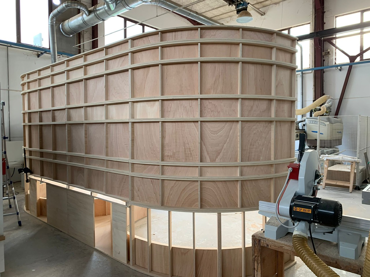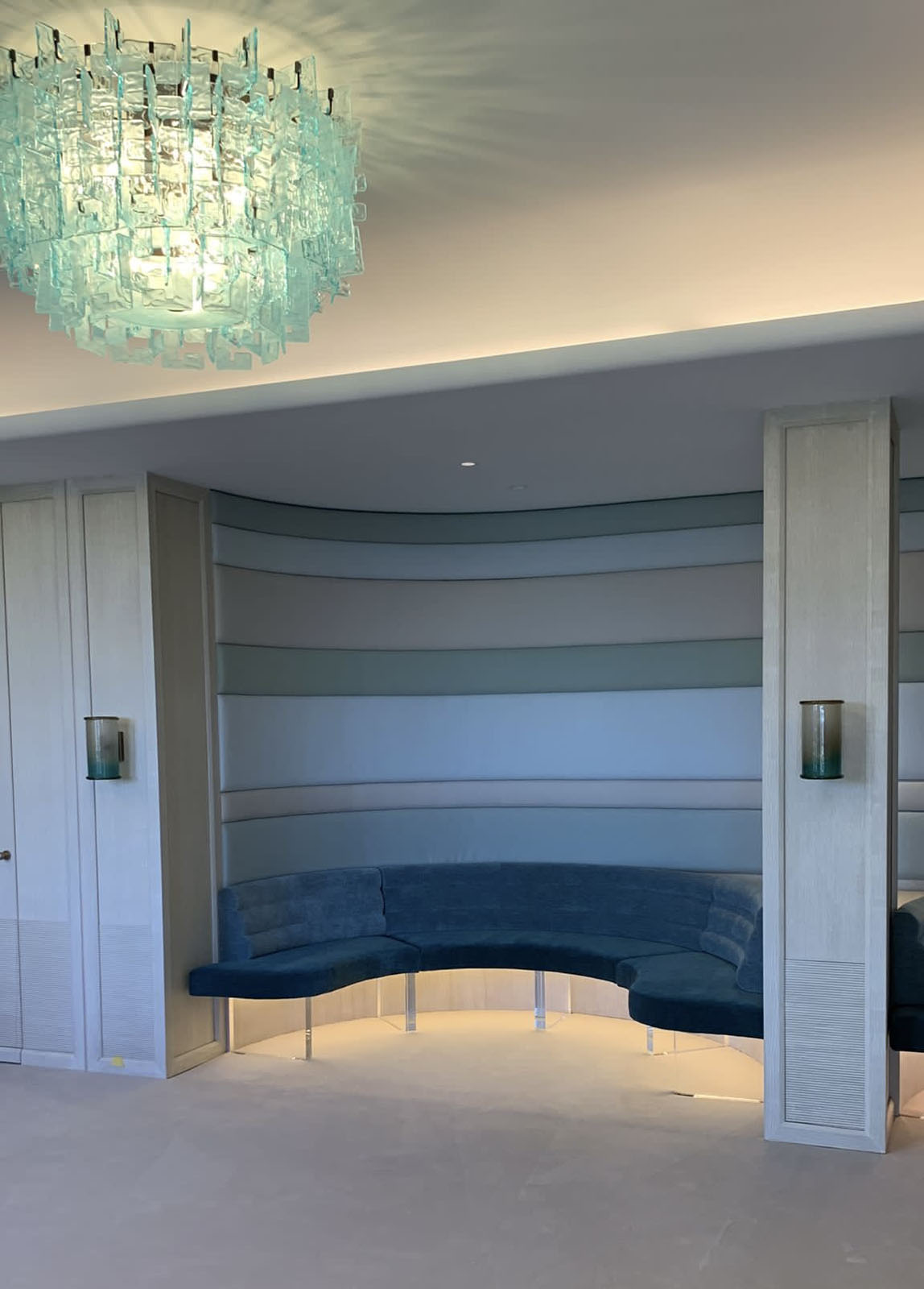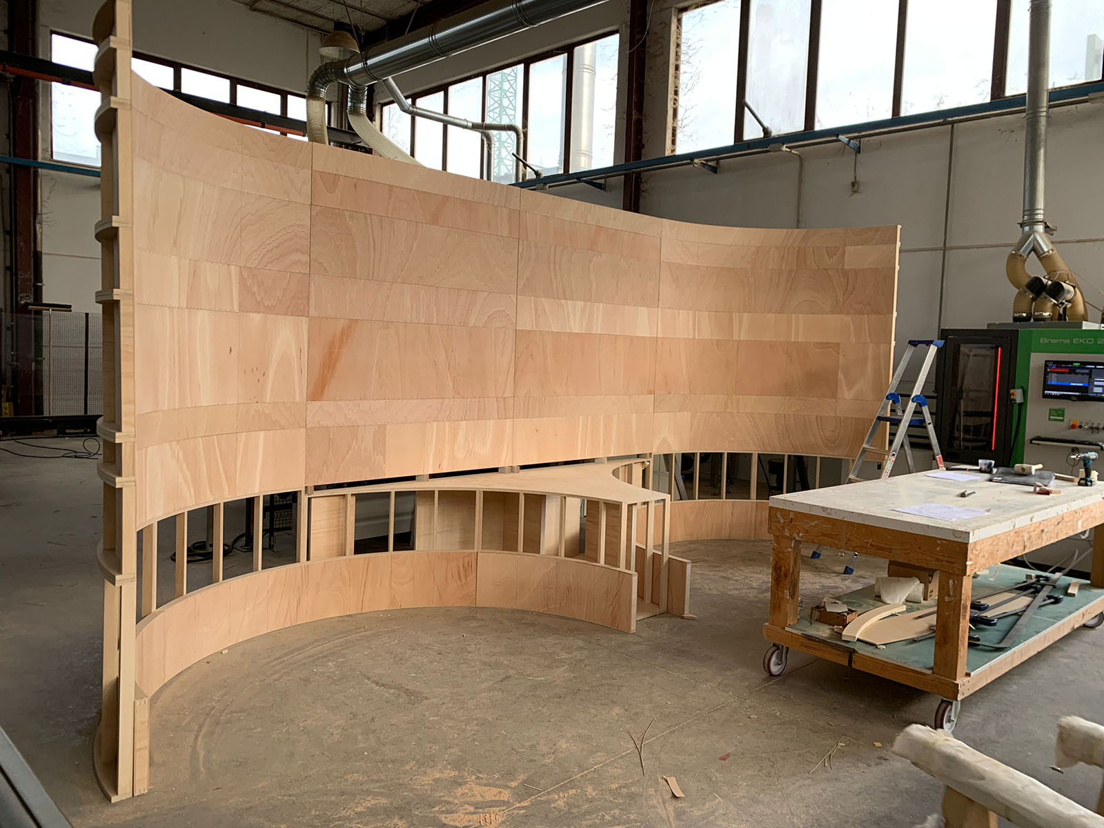 • Pareti curve del Foyer costituite da elementi semitondi in masello singolarmente imbottiti e rivestiti in tessuto e poi applicati ai curvati delle pareti, delle nicchie e delle porte;