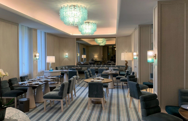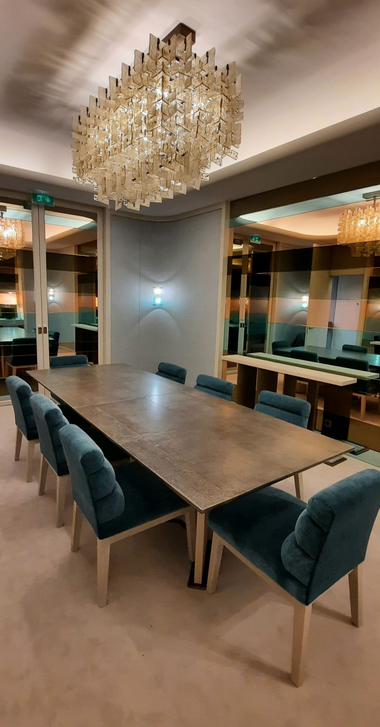 • Tavoli in rovere sbiancato con top rivestiti da pergamena verniciata;