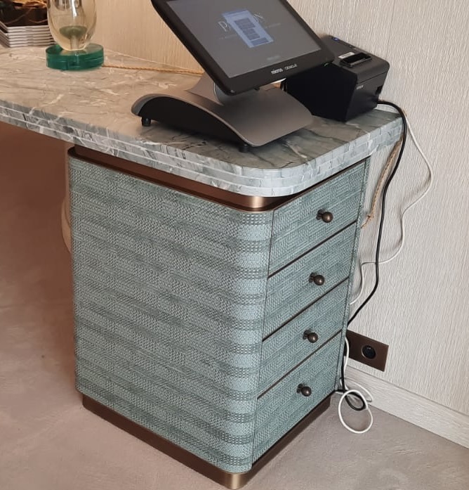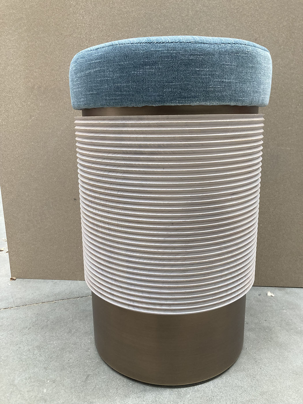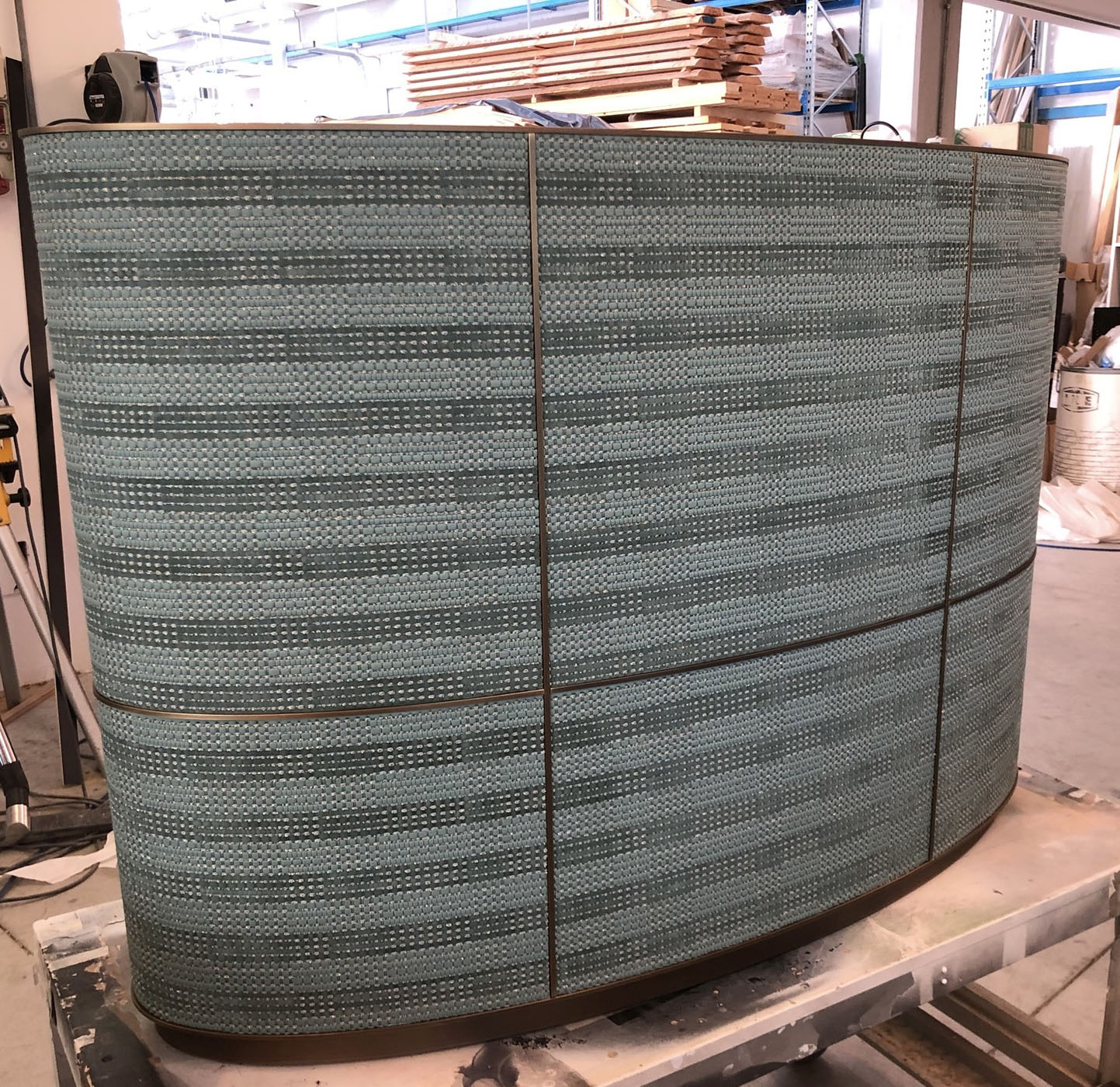 • Mobili in appoggio di varie forme rivestiti con tessuto e pelle intrecciati, dettagli e profili in ottone bronzato.