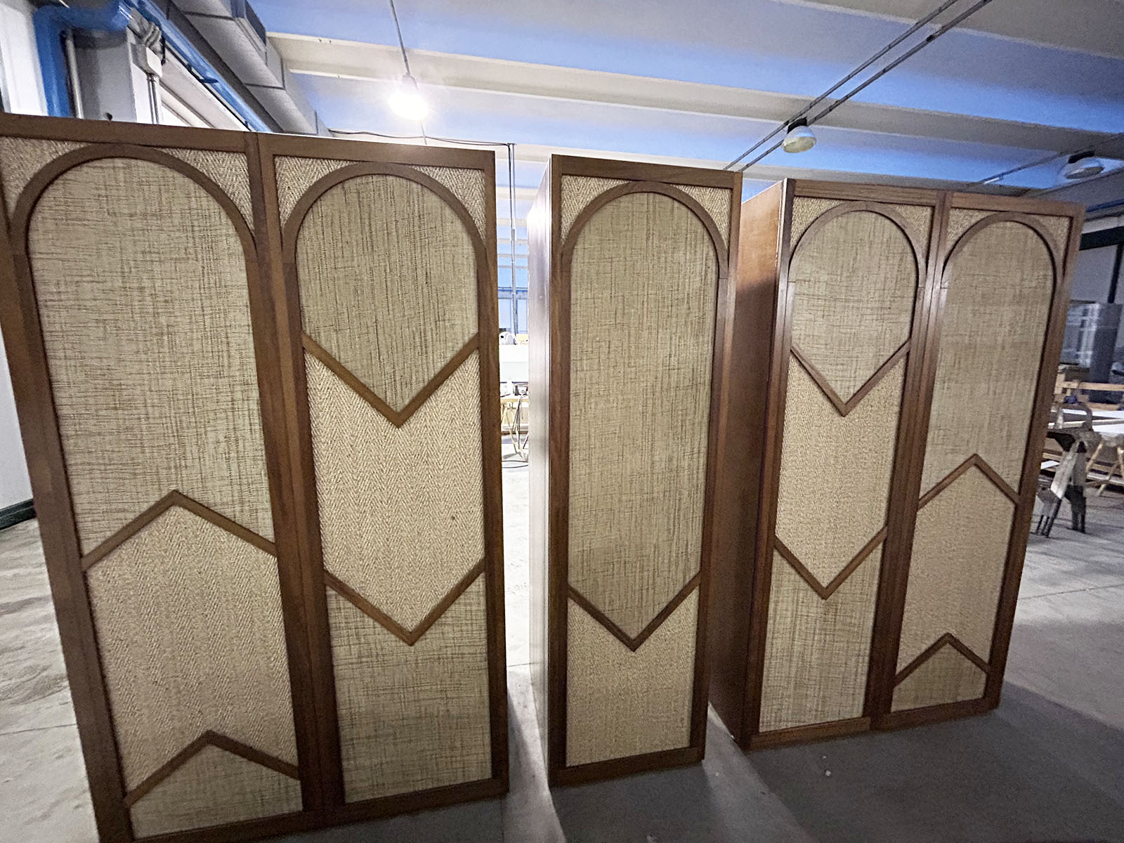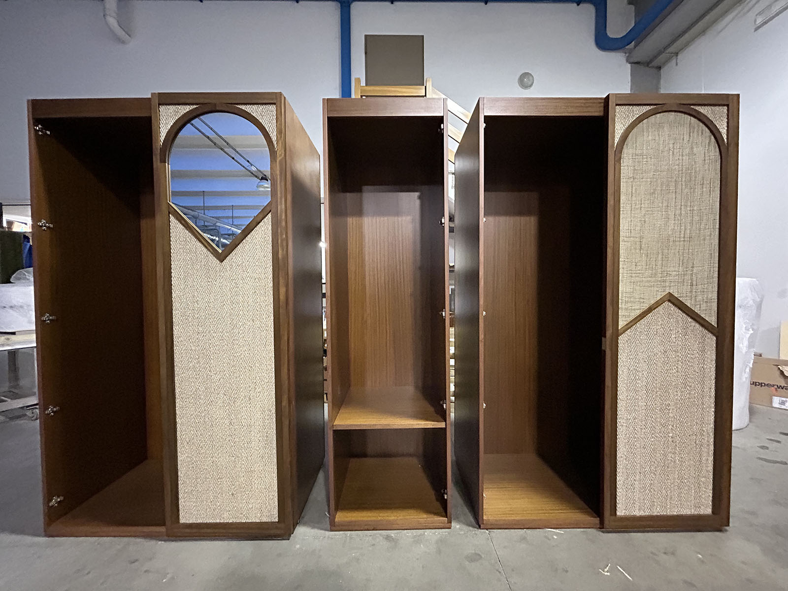 - Armadio guardaroba bifacciale in legno di iroko con ante a telaio impreziosite da specchi e rafia;