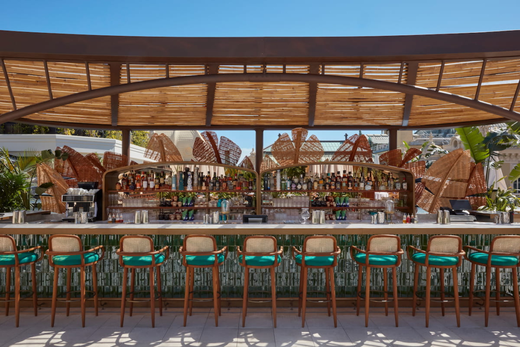 - Bancone del roof bar in acciaio inox con strutture portabottiglie ad arco in multistrato marino patinato verniciato oro a campione;