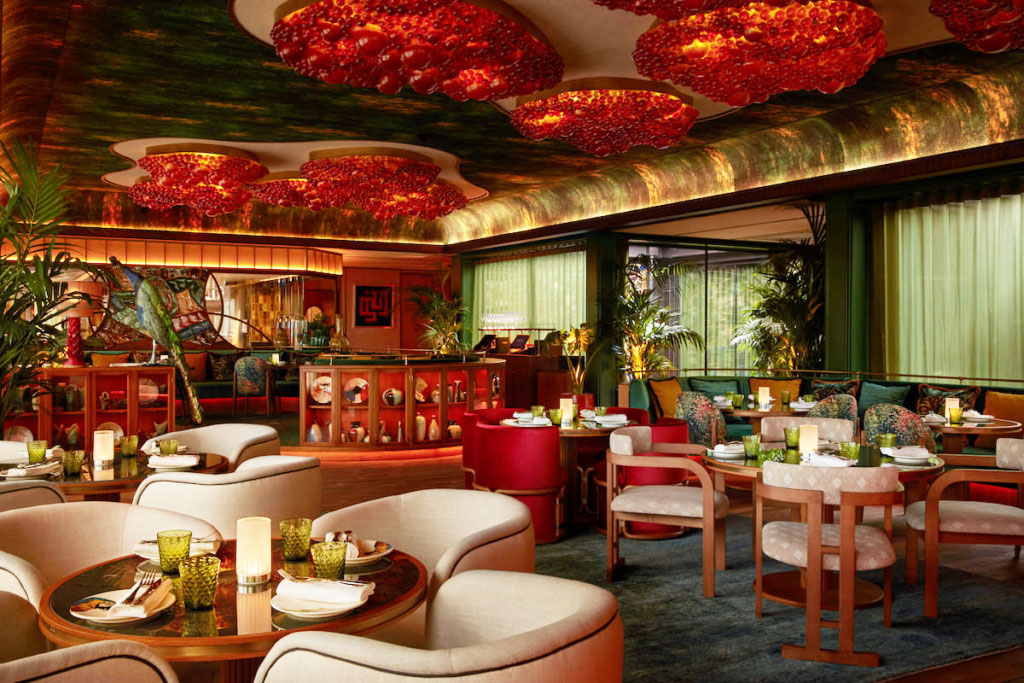 - Pareti vetrate con struttura in rovere e specchi sagomati ad inglobare un’opera d’arte centrale;